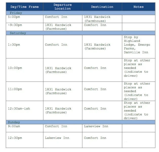 We have organized a bus to provide transportation on Friday, Saturday & Sunday. The schedule is below. If you have questions, please email us at patrickandblair2016@gmail.com.